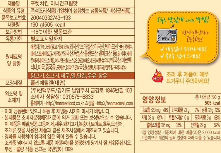 냉동)포켓치킨 어니언크림맛180g*5 > 냉동식품